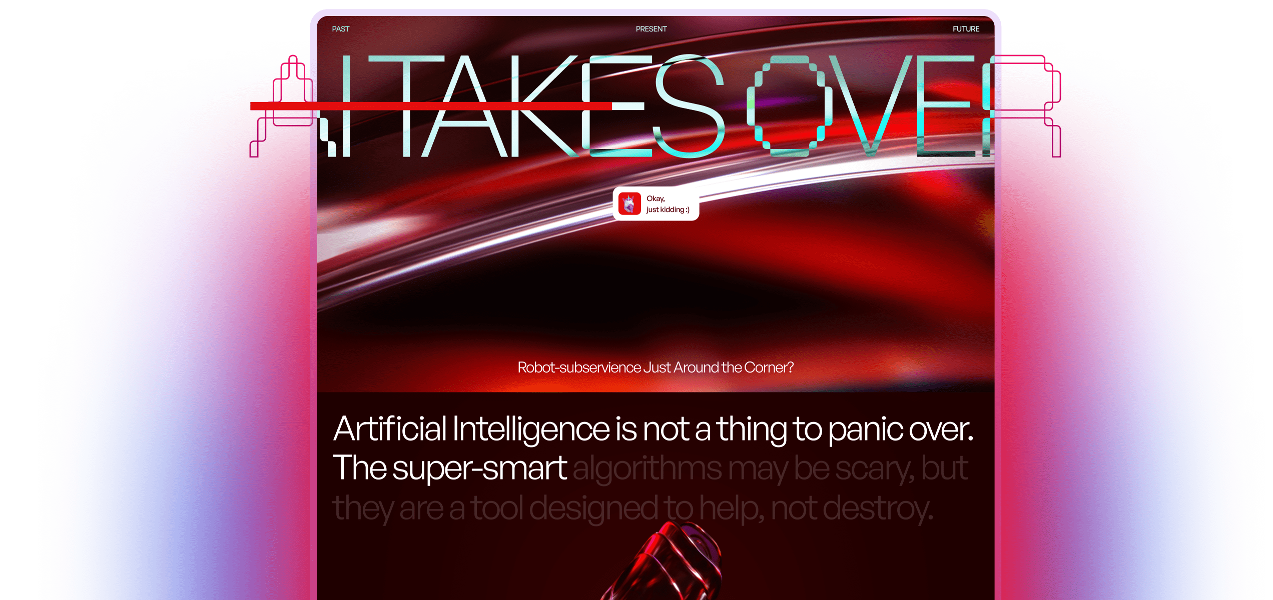 We told the story of AI and explained why it's not something worth stressing over. What's more, we did so through the medium of an innovative no-code solution in the form of a Webflow-powered website. With fluild animations and eye-catching visuals, as well as absorbing storytelling, the AI Takes Over website offers an educational and engaging take on what AI really is.