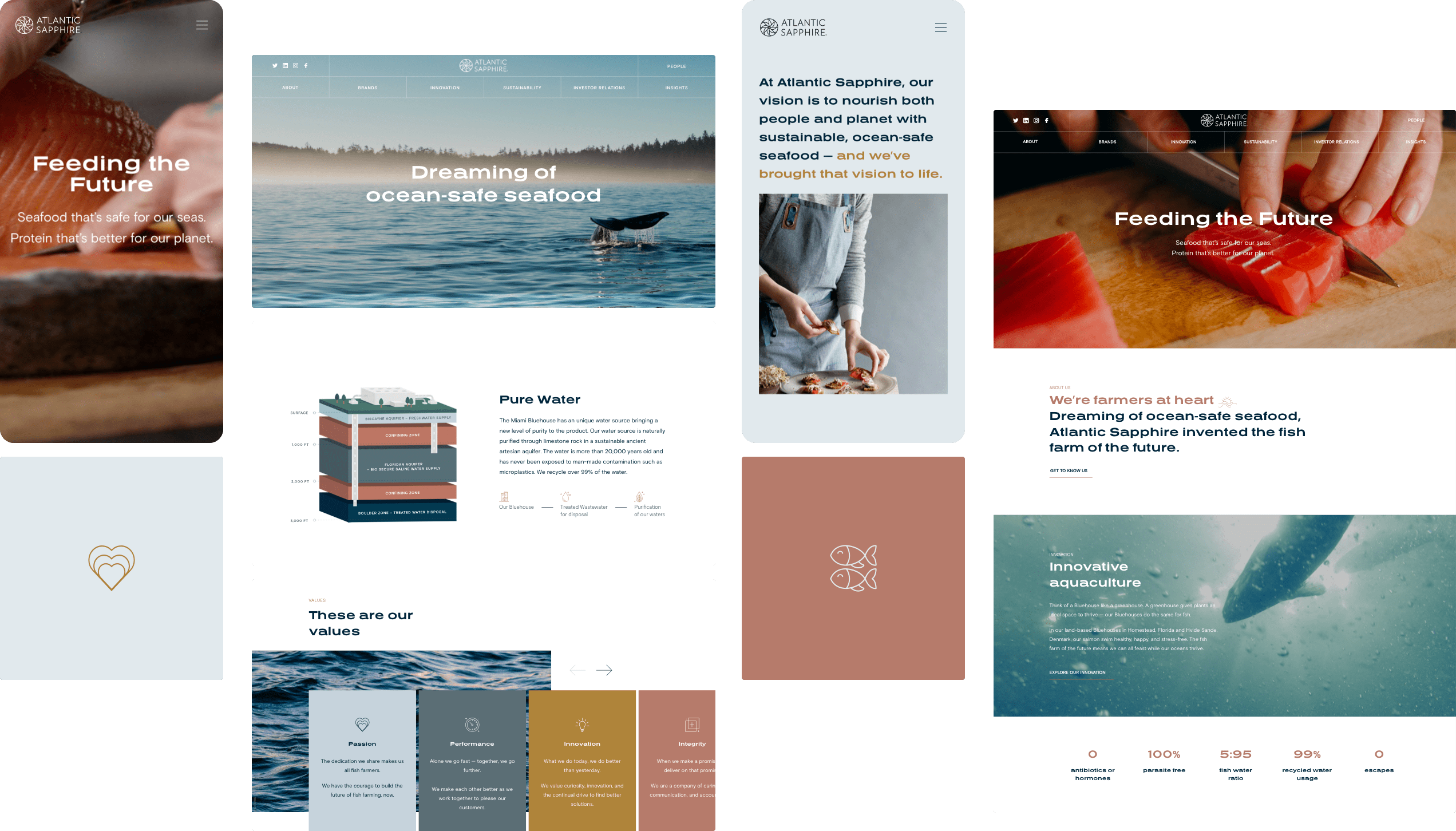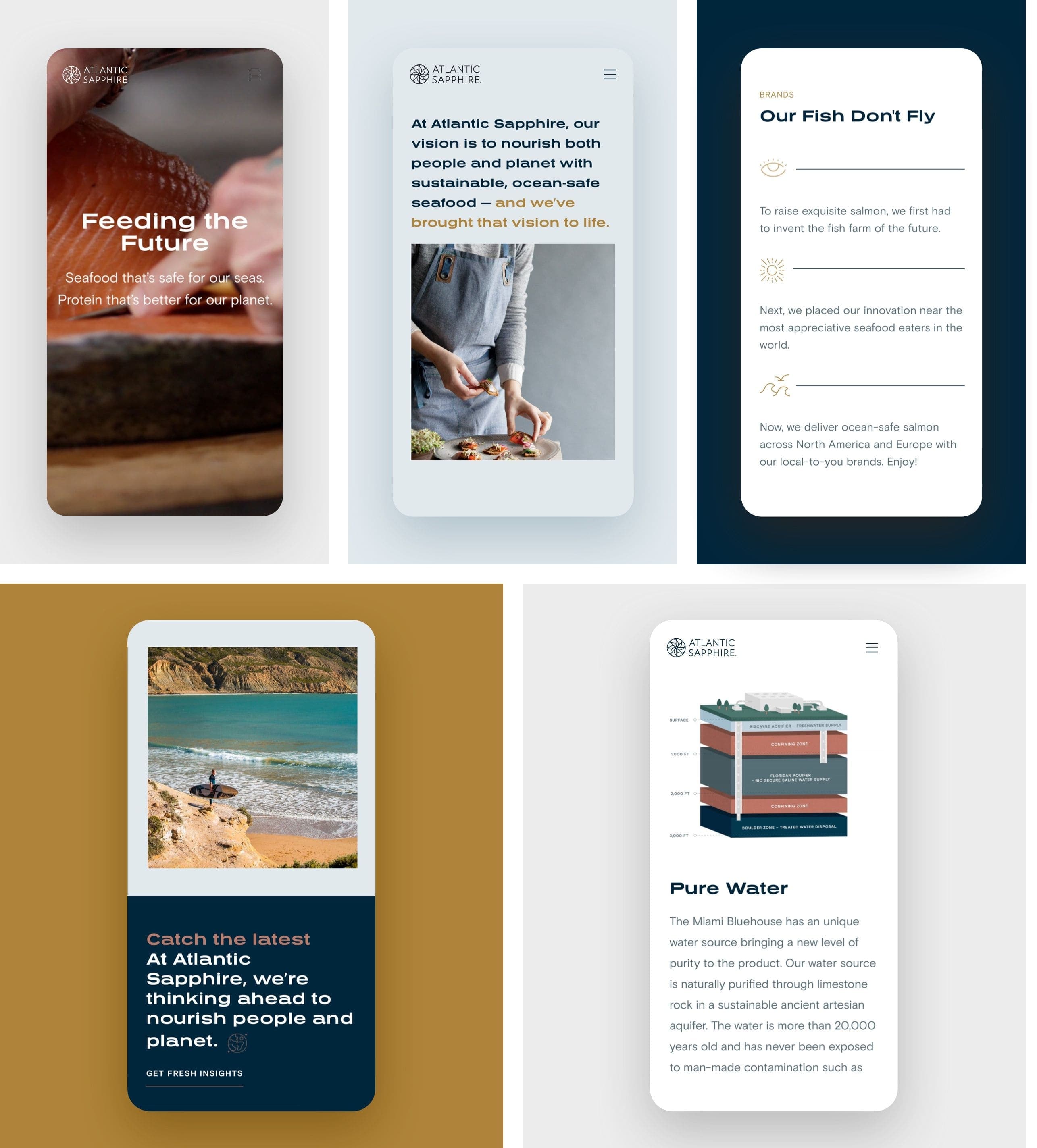 Although we were not directly involved in creating the company's brand kit, our team diligently followed Atlantic Sapphire's established branding guidelines. To maintain consistency, we selected the bold and impactful Presicav Bold font for headings, while utilizing the clean and legible Basis Grotesque font for body text. In terms of colors, we incorporated highlights that included a warm golden tone, a soft earthy hue, a deep navy shade, and a subtle grayish-blue, adding vibrancy and depth to key elements throughout the website design.