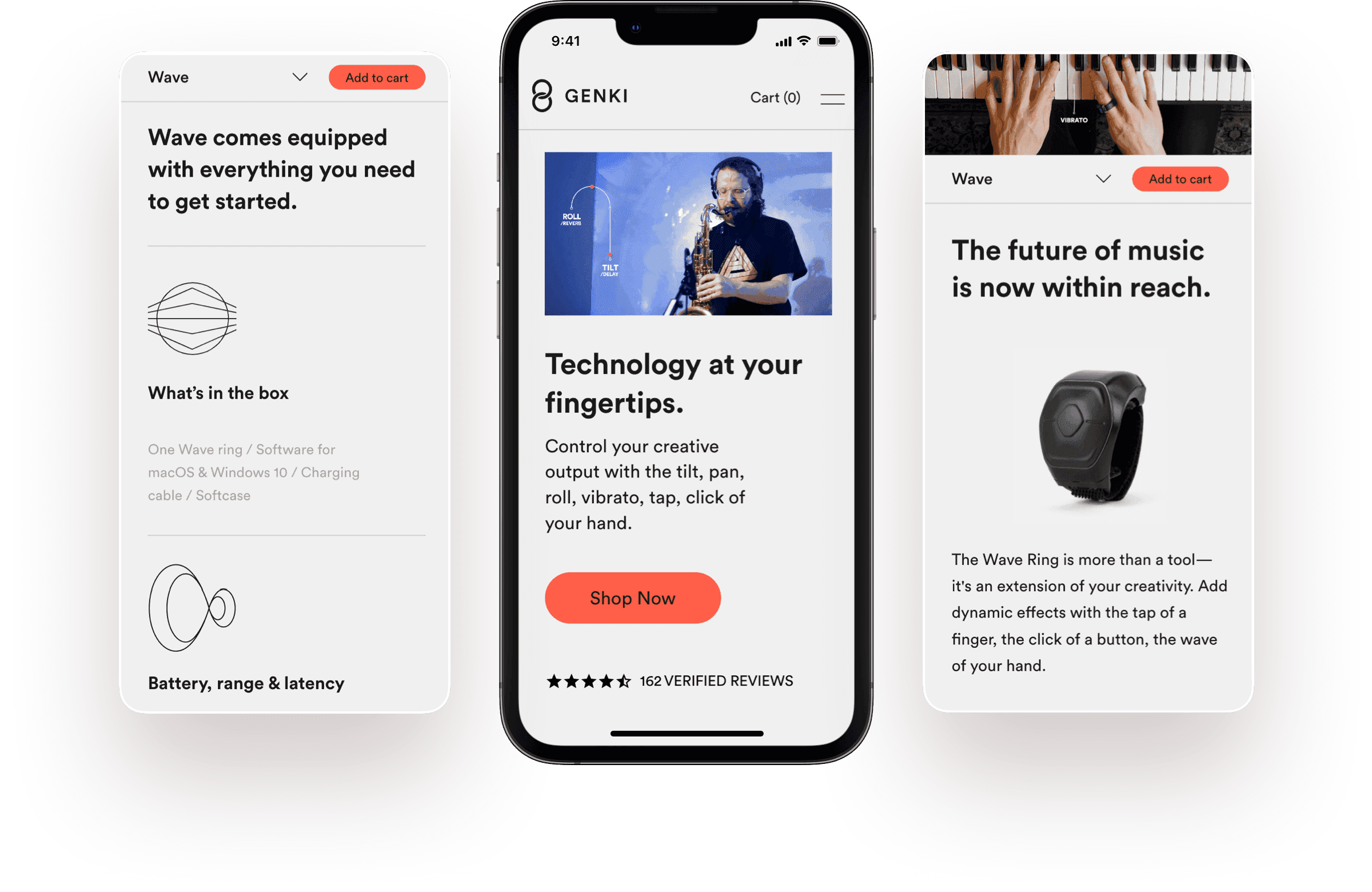 The subtle yet significant features of the Genki Instruments wearables are most effectively communicated through video. Consequently, the website extensively incorporates this format, demonstrating how the products function and operate in real-life scenarios.