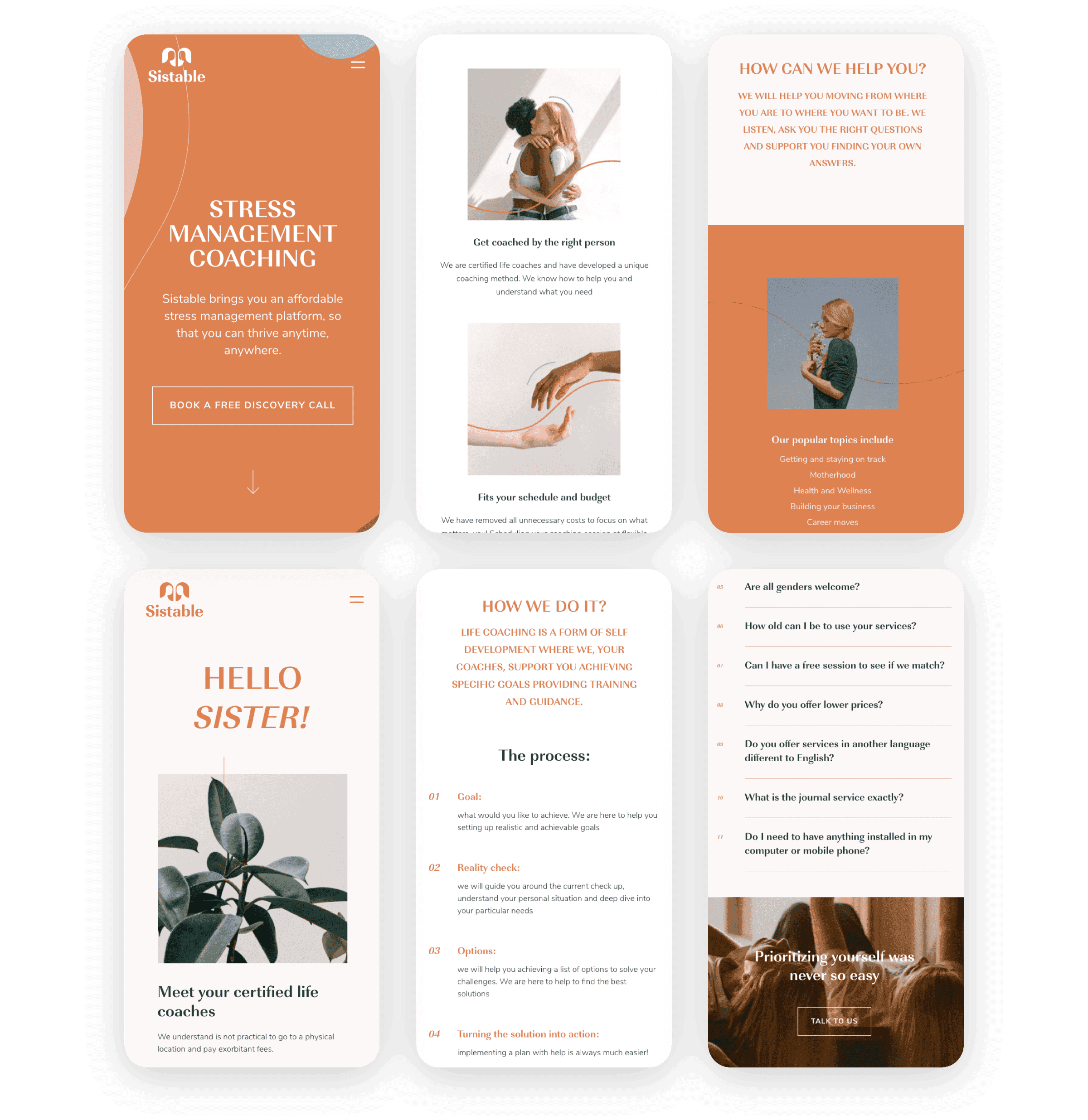 Visiting Sistable's homepage feels akin to receiving a comforting embrace from a friend, coupled with an encouraging nudge towards personal growth. The use of a warm color palette crafts an atmosphere of welcome and support, enhancing the brand's visual narrative. The inviting ambiance is further accentuated by a distinct value proposition and a compelling call to action, leading users towards scheduling a complimentary discovery session.
