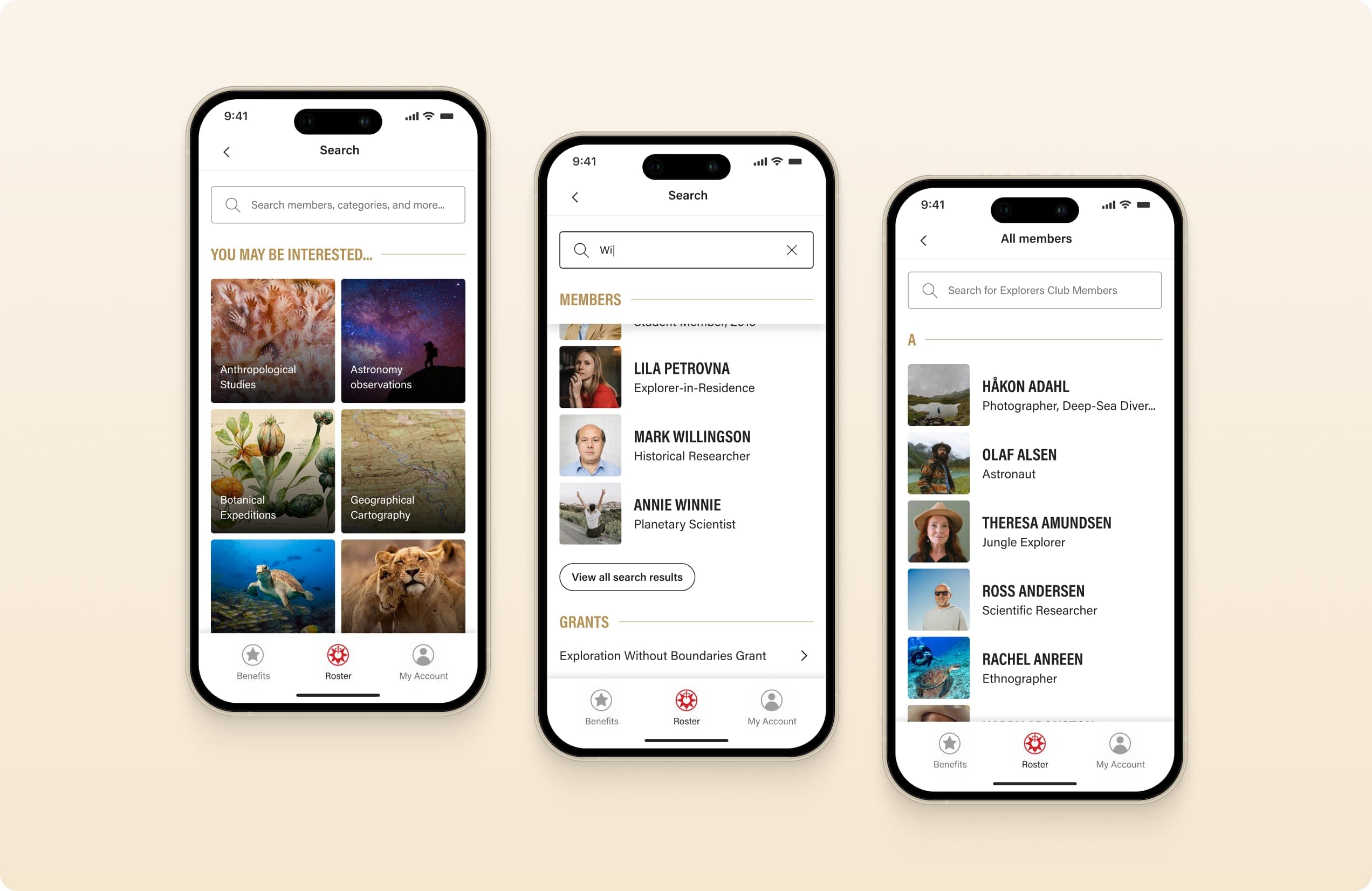 The roster allowed members to browse and connect with others based on exploration interests and chapter membership. Search and filters supported quick discovery of relevant people.